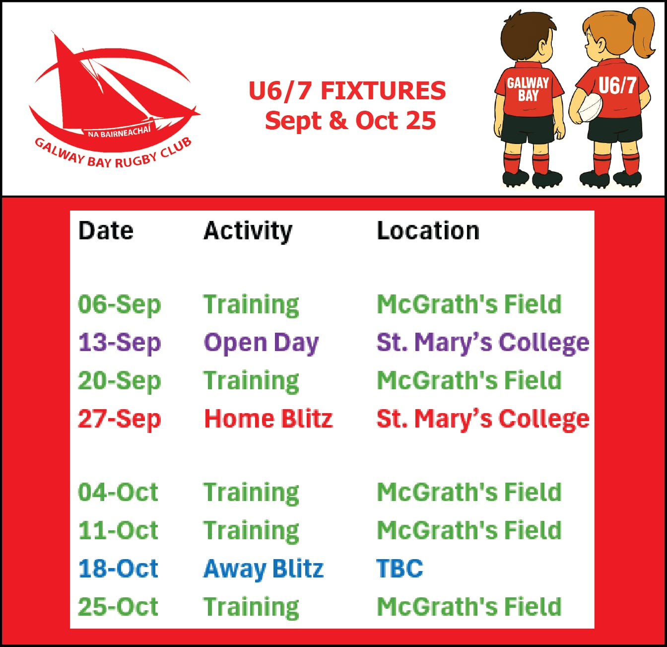 Mini Rugby is back! All sessions take place in McGrath’s Field, Knocknacarra unless otherwise noted. Below are the training times for each age group, followed by fixture details for September and October.